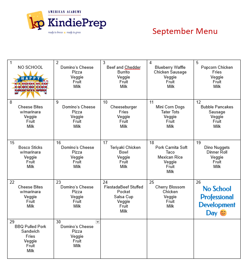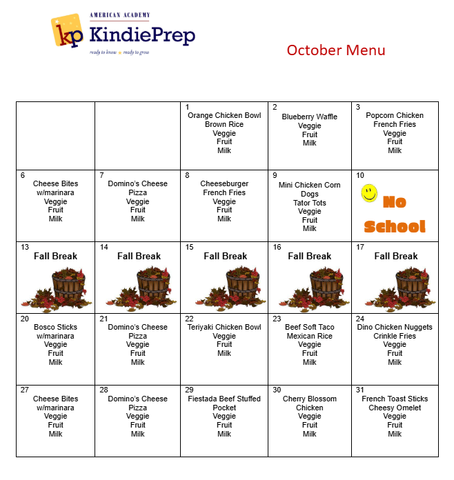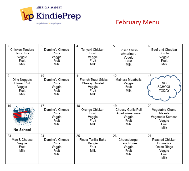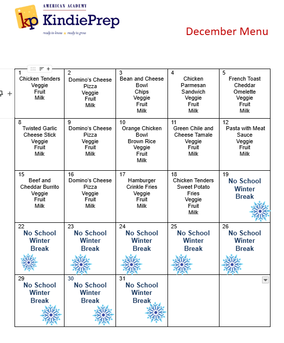 This menu is based off the DCSD menu that is available at the beginning of the month. Changes to the menu may occur that we are not aware of, so below is the link to the DCSD Nutrition Services menu page. KindiePrep always gets the first/main choice, no options.